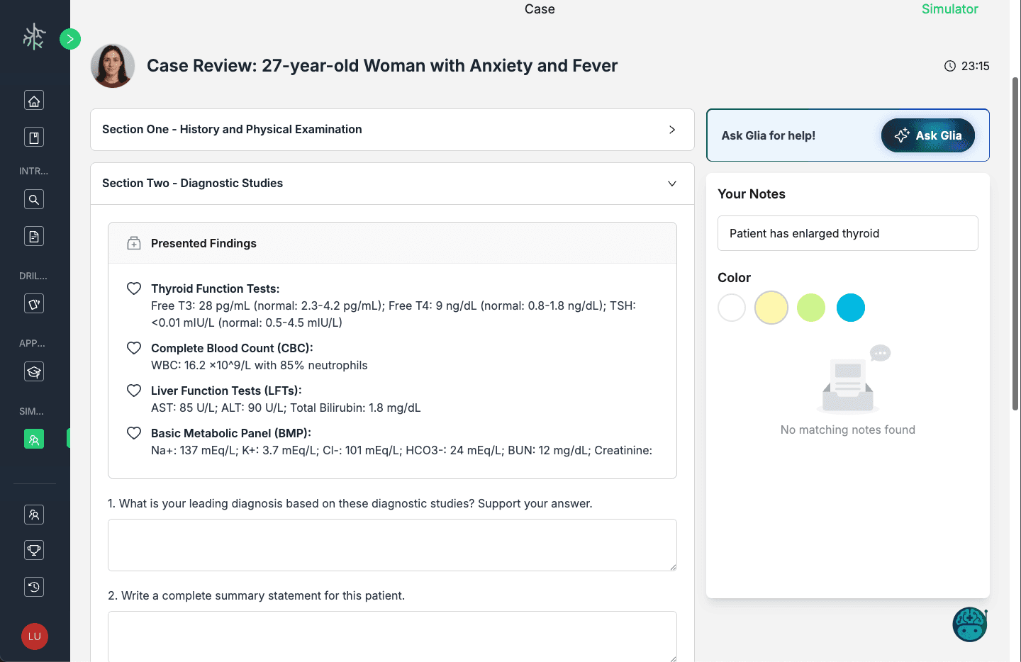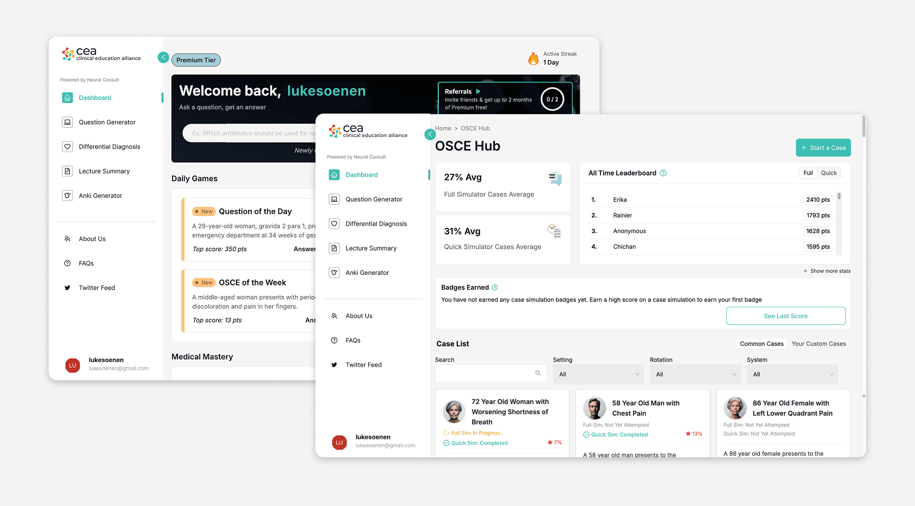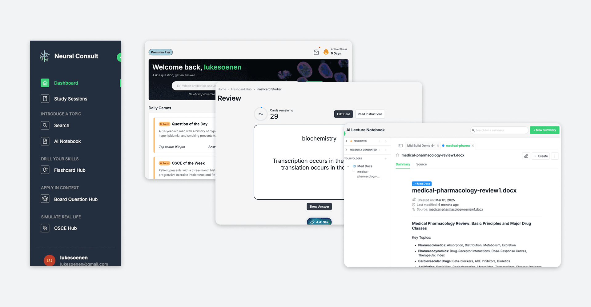 Our main product, Neural Consult, offers students a more accessible, personalized, and engaging way to interact with their educational content. It contains a core set of AI powered features including patient simulations, lecture summaries, and flashcard generation. Also, it provides deep analysis into students specific strengths and weaknesses’. This leads to less time spent preparing study materials and more time learning.